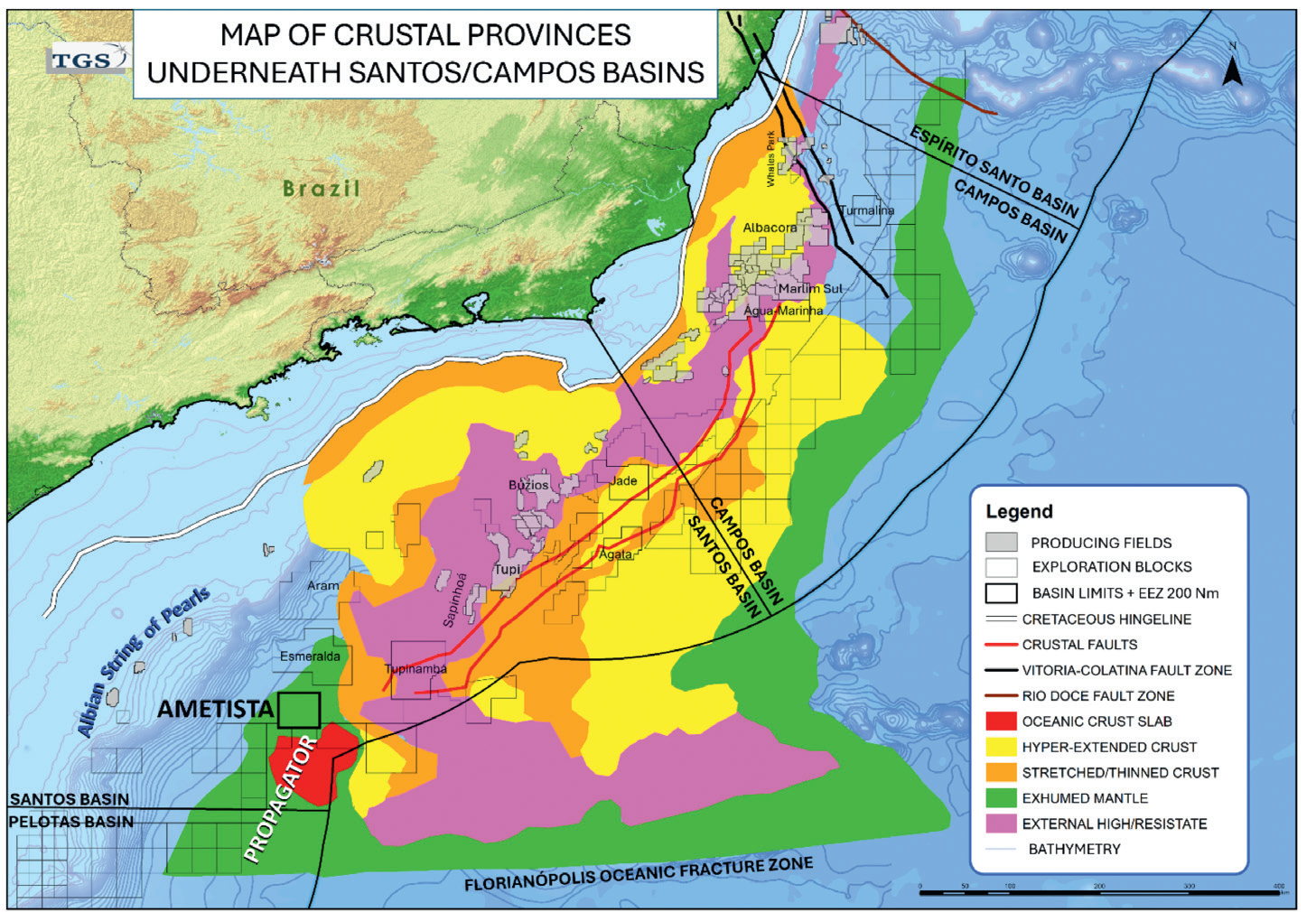 Figure 1 - Location of Ametista Block on the map of the crustal provinces of the Santos and Campos Basins (modified from Zalan, 2024). Notice its special location upon the V-shaped tip of exhumed mantle. Albian string of pearls refers to several producing Albian age carbonate-hosted oil and gas fields.