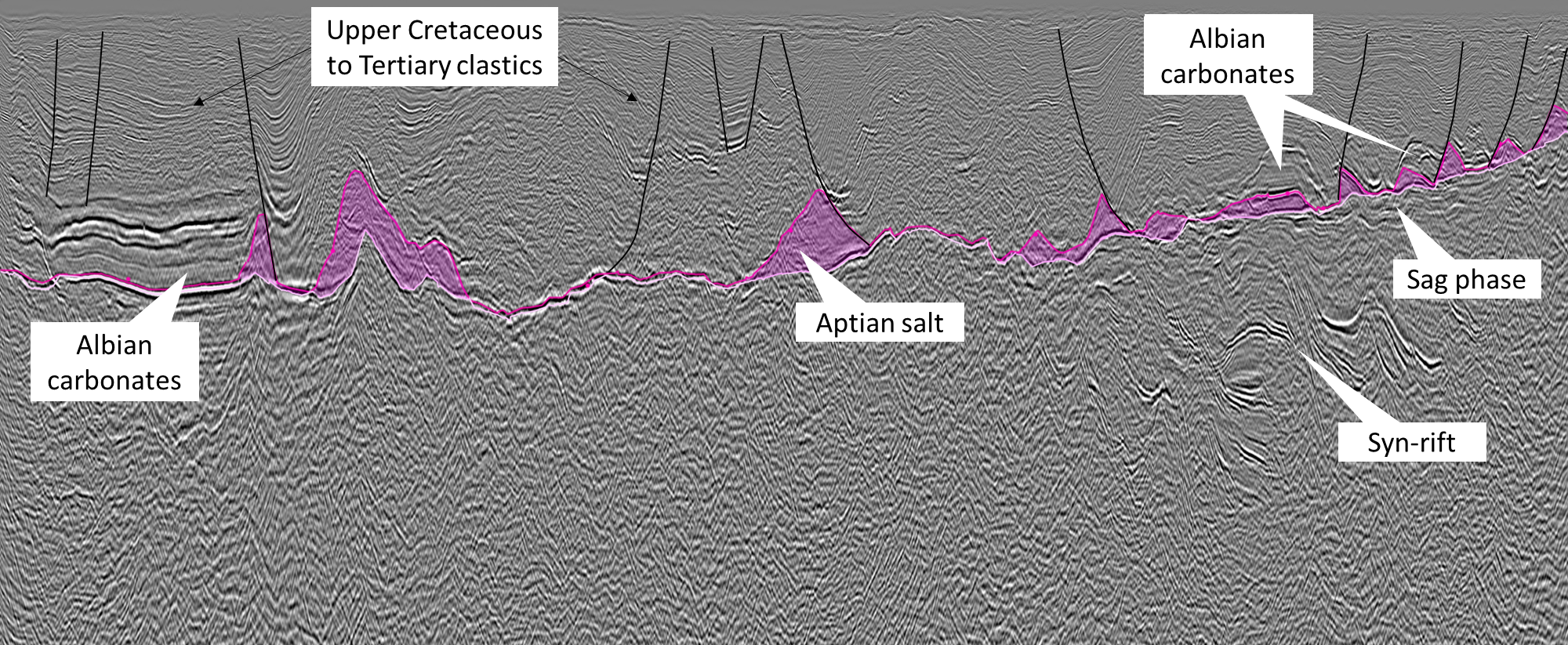 Initial exploration focused on Lower Albian carbonates, then progressed outboard to Tertiary sandstones. However, recent exploration (especially in Kwanza) has concentrated on the pre-salt, the imaging of which is enhanced by the reprocessing of this data.