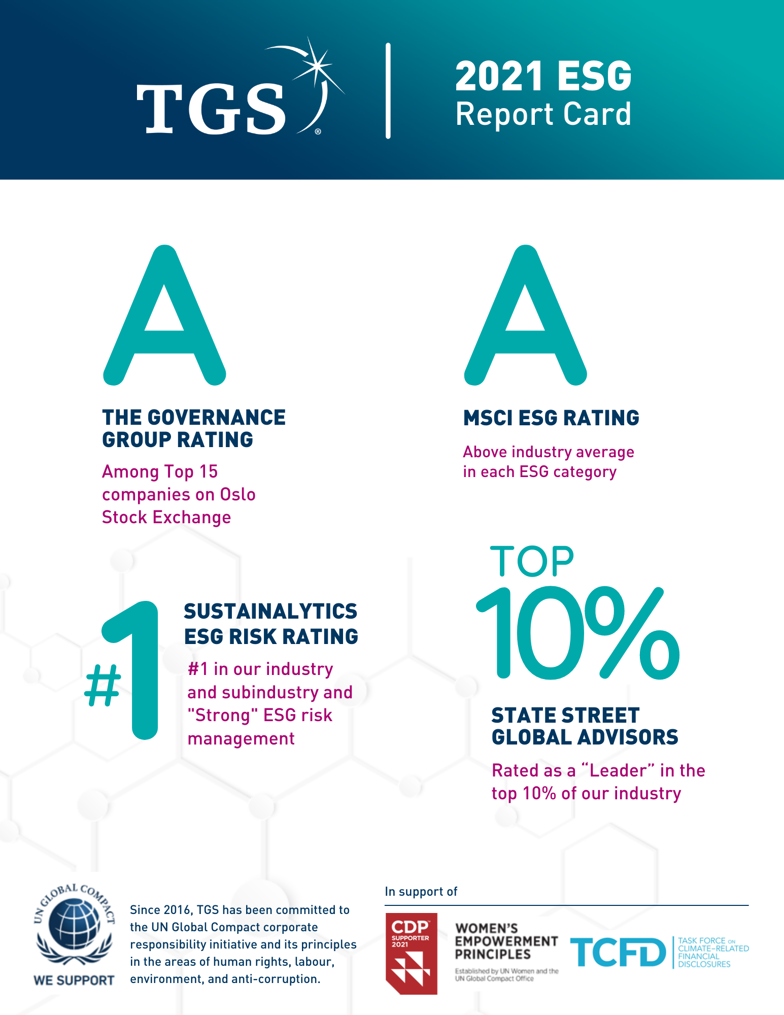 In accordance with TGS’ Code of Conduct and Statement of Values, TGS expects that its suppliers, vendors, and contractors uphold the highest standard of business ethics, transparency and sustainability and be committed to the principles set forth in TGS’ Supplier Code of Conduct.